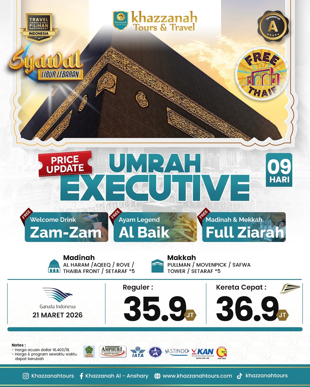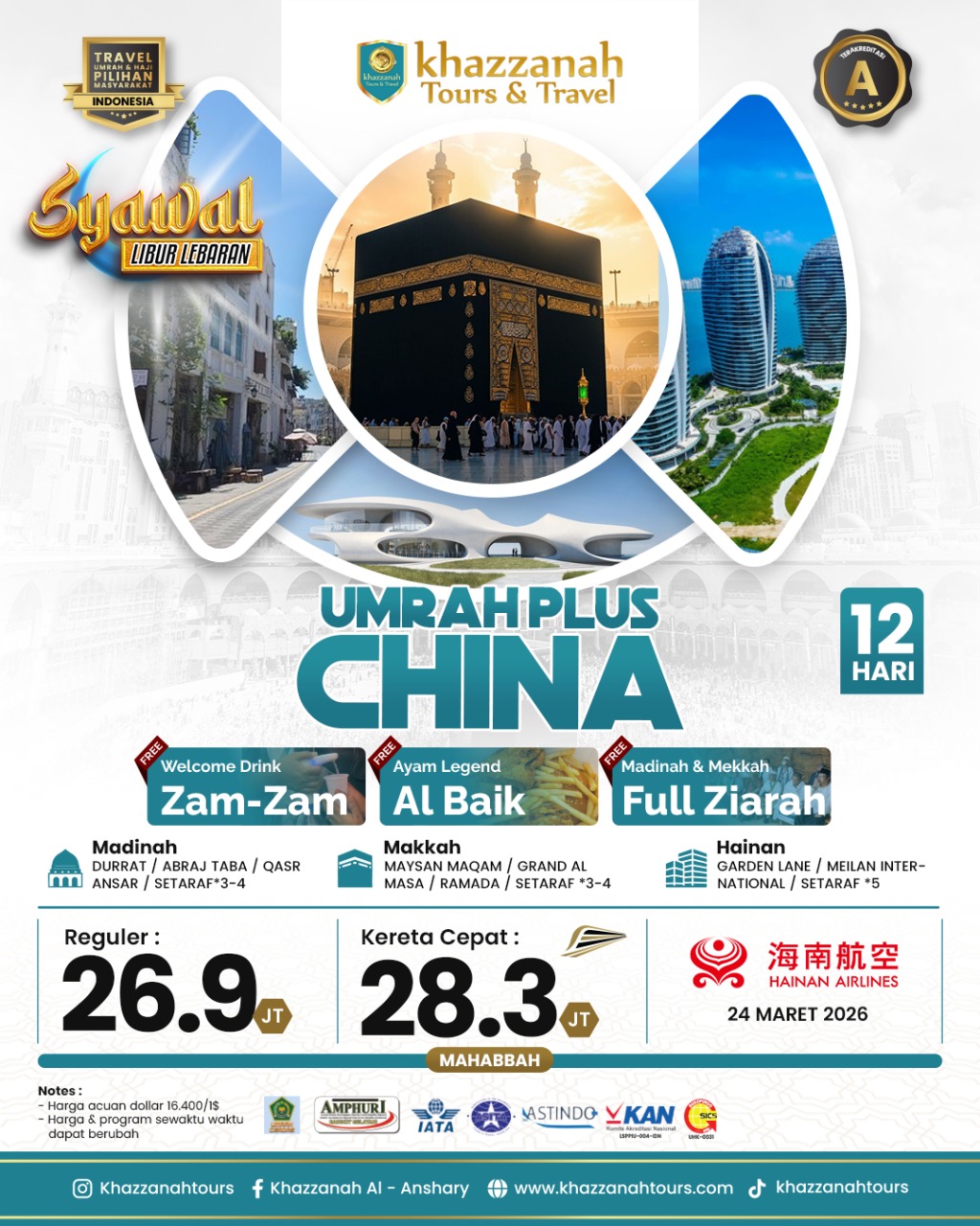 Sejak 2001, Khazzanah Tour telah memperkenalkan terobosan baru dalam perjalanan umrah dan haji dengan prinsip utama "Melayani Sepenuh Hati". Kami menjamin keamanan, kenyamanan, dan kepastian keberangkatan bagi calon jamaah, sambil menciptakan kenangan tak terlupakan dan meraih pahala besar dalam ibadah umrah yang mabrur. Khazzanah Tour menawarkan beragam program termasuk Paket Umroh Promo, Paket Umroh Regular, Paket Umroh Plus, Haji Plus, dan banyak lagi.