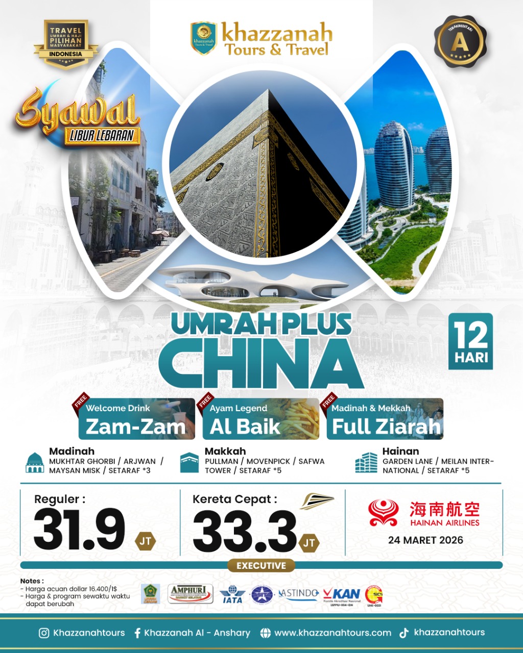 Sejak 2001, Khazzanah Tour telah memperkenalkan terobosan baru dalam perjalanan umrah dan haji dengan prinsip utama "Melayani Sepenuh Hati". Kami menjamin keamanan, kenyamanan, dan kepastian keberangkatan bagi calon jamaah, sambil menciptakan kenangan tak terlupakan dan meraih pahala besar dalam ibadah umrah yang mabrur. Khazzanah Tour menawarkan beragam program termasuk Paket Umroh Promo, Paket Umroh Regular, Paket Umroh Plus, Haji Plus, dan banyak lagi.
